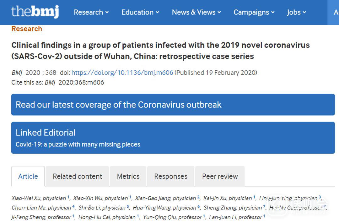 2020年2月19日,BMJ刊登了李兰娟院士团队的一项最新研究“Clinical findings in a group of patients infected with the 2019 novel coronavirus (SARS-Cov-2) outside of Wuhan, China: retrospective case series(武汉外地区新冠病毒感染患者的临床发现)”,纳入62例在浙江省确诊的COVID-19病例进行回顾性研究。