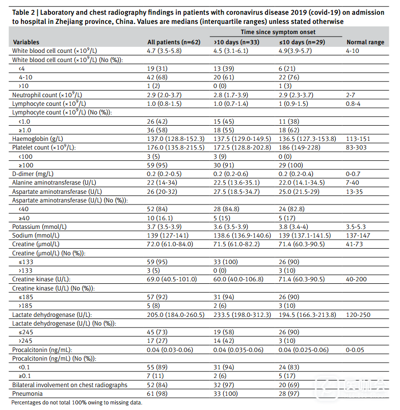 入院时,62例患者中,有19例(31%)出现白细胞减少(白细胞数<4×109/L),26例(42%)出现淋巴细胞减少(淋巴细胞数<1.0×109/L;表2),D -二聚体水平在正常范围内。10例(16%)患者的天门冬氨酸氨基转移酶水平升高。55例(89%)患者血清降钙素原水平正常。