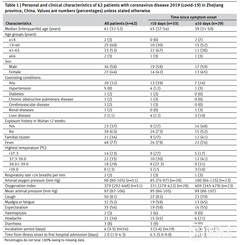 截至2020年1月26日,研究人员共收集了浙江省62例SARS-Cov-2感染患者的临床资料。25例(40%)患者的年龄在19-40岁,33例(53%)患者的年龄在41-65岁,2例(3%)患者分别为10岁和11岁,65岁及以上的患者有2例(3%)。年龄中位数为41岁(IQR 32-52岁;表1)