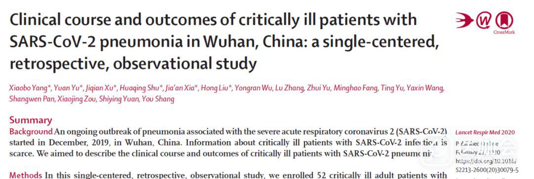 2020年2月21日,柳叶刀旗下子刊《柳叶刀呼吸医学》(Lancet Respiratory Medicine,IF=22.992)在线发表了一项新研究:“Clinical course and outcomes of critically ill patients with SARS-CoV-2 pneumonia in Wuhan, China: a single-centered, retrospective, observational study”。聚焦新冠病毒(SARS-CoV-2)感染的肺炎危重患者的病情进展和结局。