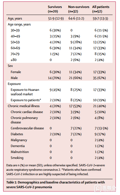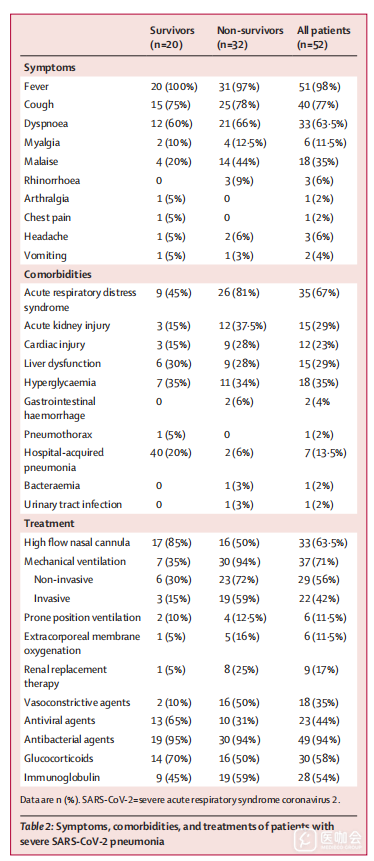 这是一项单中心、回顾性、观察性研究,纳入2019年12月24日至2020年1月26日入住武汉金银潭医院ICU的危重新冠肺炎患者,一共有52例。研究收集了患者的人口统计学数据、症状、实验室检查、共患病、治疗和临床结局等信息。