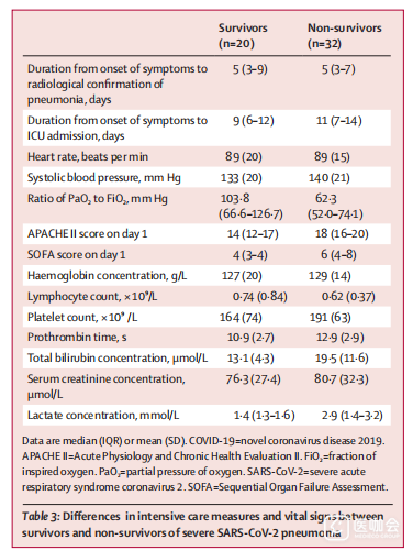 与幸存者相比,死亡患者的年龄更大(64.6 [SD 11.2] vs 51.9[12.9]),有慢性病的占比更高(17[53%]vs 4[20%];表1)。从症状出现到肺炎影像学确诊、从症状出现到进入ICU的中位时间,两组患者均无差异(表3)。