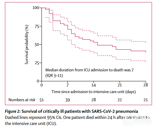 主要结局方面,52例 SARS-CoV-2感染的危重患者中,32例(61.5%)患者在发病28天内死亡,从进入ICU到死亡的中位时间为7天(IQR 3-11)(图2)。