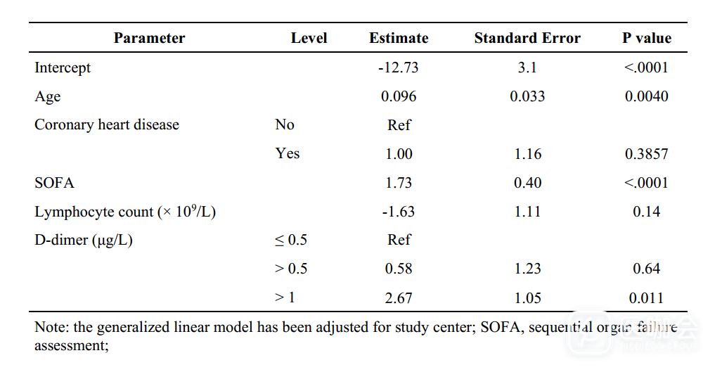 多因素logistic回归模型纳入了有完整数据的171例患者(53例死亡患者和118例幸存患者)。结果发现,年龄较大、SOFA(序贯器官衰竭评分)较高、入院时d-二聚体水平超过1μg/ L,与死亡风险增加存在相关性(表3)。广义线性模型的结果也与上述结果类似(表4)。