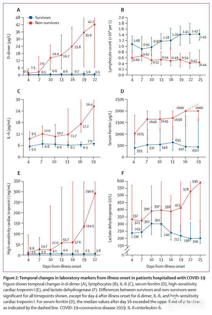 整个临床过程中,与幸存者相比,死亡患者的d-二聚体、高敏心肌肌钙蛋白I、血清铁蛋白、乳酸脱氢酶和IL-6的水平明显升高,并且随着疾病恶化而持续升高(图2)。死亡患者中,高敏心肌肌钙蛋白I浓度在发病后第16天迅速升高;无论是幸存者还是死亡患者,乳酸脱氢酶在发病早期均增加,但幸存者从第13天开始下降。