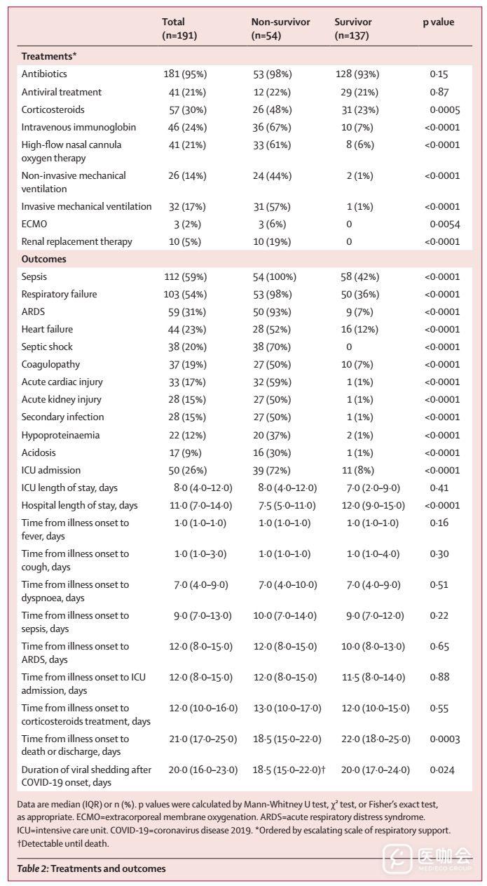 181例(95%)患者接受了抗生素治疗,41例(21%)患者接受了抗病毒治疗(洛匹那韦/利托那韦)(表2)。