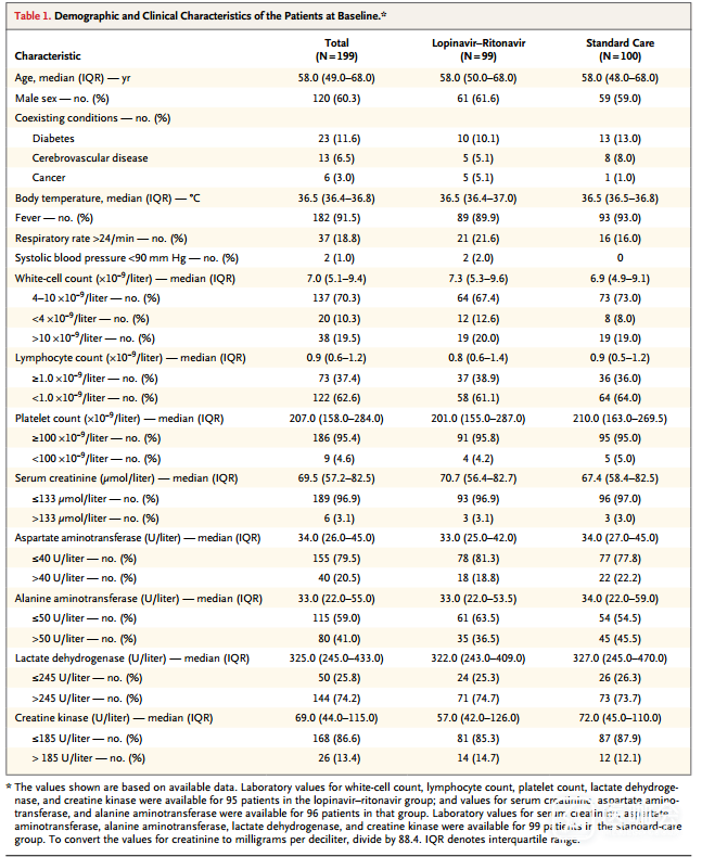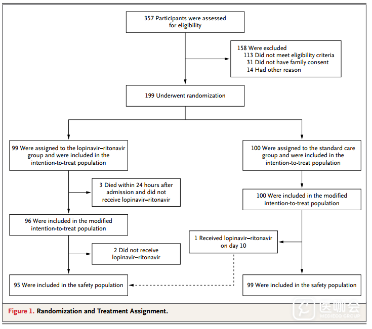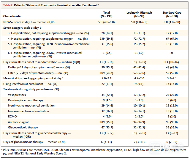 在199例接受随机分组的患者中,99例患者被分配到洛匹那韦-利托那韦组,100例患者被分配到仅标准治疗组。在洛匹那韦–利托那韦组中,有94例(94.9%)接受了分配的治疗(图1),5例未接受洛匹那韦-利托那韦治疗:3例在随机分组后24小时内死亡,2例在随机分组后主治医师不建议接受洛匹那韦-利托那韦治疗。