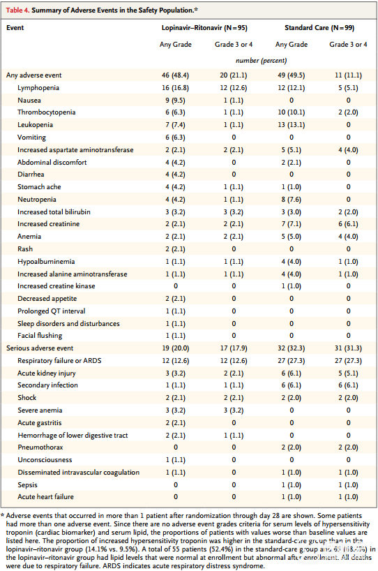 51例患者发生了严重的不良事件:洛匹那韦–利托那韦组19例,标准治疗组32例。洛匹那韦–利托那韦组有4例严重胃肠道不良事件,而标准治疗组则没有,研究人员判定这4例不良事件均与试验药物有关。相比洛匹那韦–利托那韦组,接受标准治疗的患者,呼吸衰竭、急性肾损伤和继发感染更为多见。