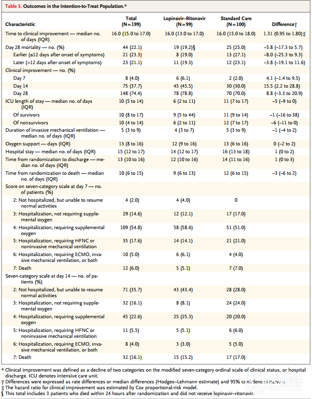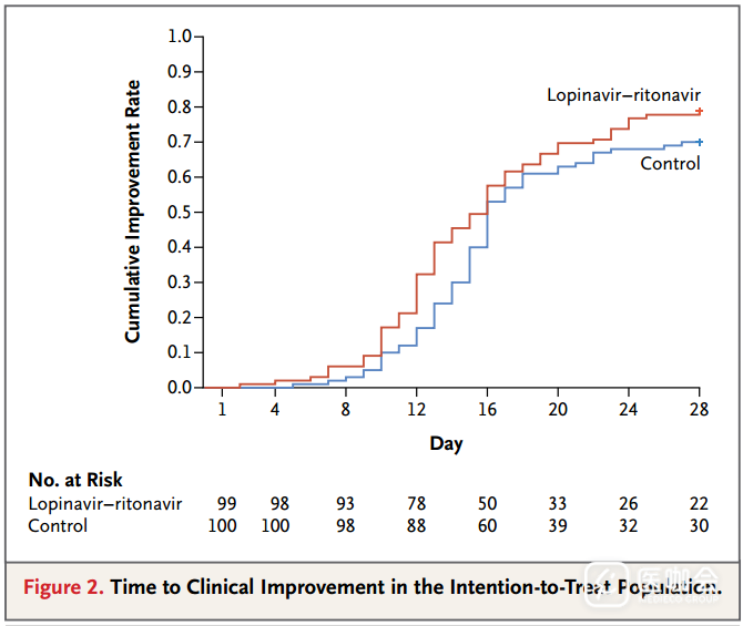 改良意向性分析中,洛匹那韦–利托那韦组的至临床改善的中位时间为15天,标准治疗组为16天(HR 1.39;95%CI 1.00 to 1.91)。