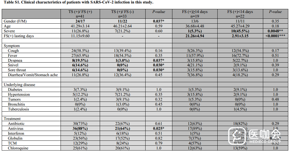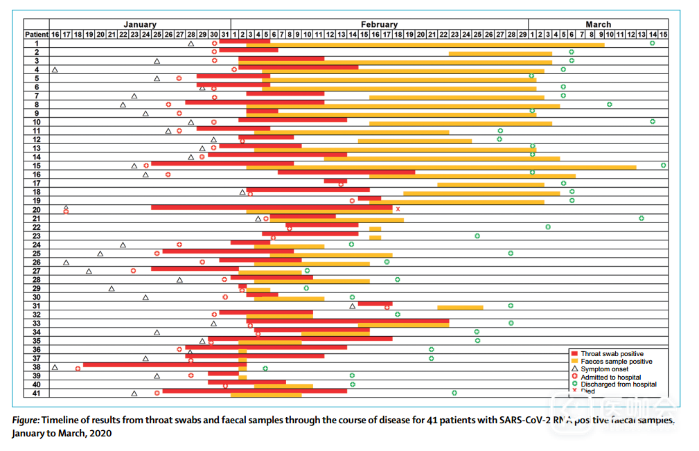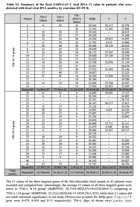 下图显示了这41名粪便样本阳性患者的完整病程。值得注意的是,患者1在呼吸道样本检测转阴后,粪便样本检测仍连续33天呈阳性,患者4在发病后47天内粪便样本的检测仍呈阳性(表S2)。