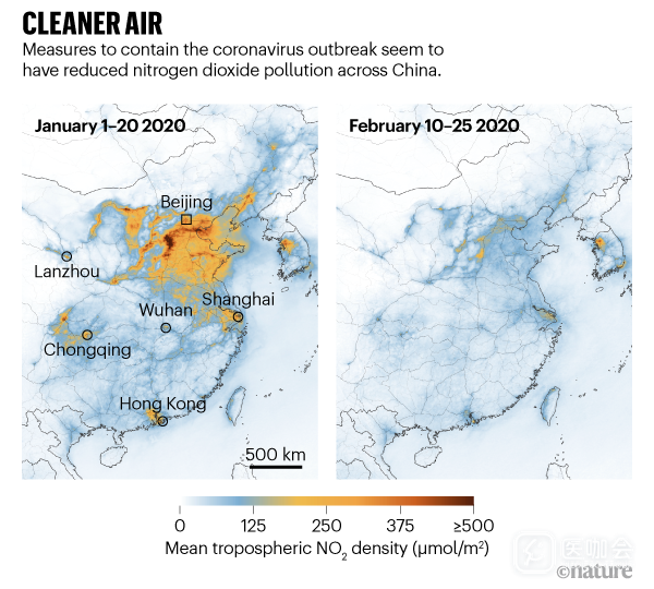 为控制疫情所作出的决策,也抑制了能源消耗和空气污染。卫星数据显示,大气中二氧化氮(NO2)含量急剧下降。初步分析表明,中国农历新年后的NO2污染比往年同期减少了10%至30%。欧洲航天局的卫星数据显示,在意大利北部(城市处于封锁状态),也出现了类似的趋势。