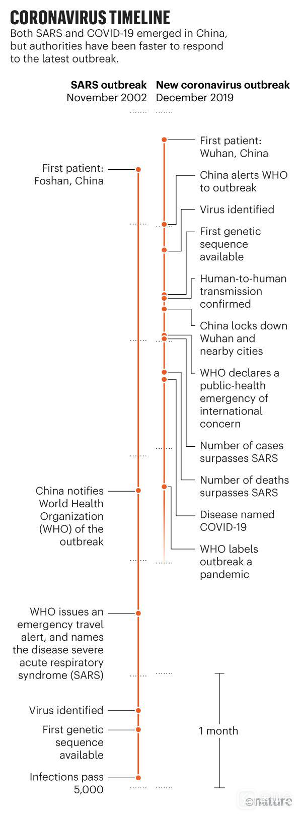 SARS爆发持续了三个月后被确定为是一种疾病,然后在近两个月的时间里才鉴定出病原体,而病毒鉴定和基因组测序当时主要来自中国以外的研究人员。相比之下,在第一个COVID-19确诊病例出现三周后,中国就通知了世卫组织。再之后两周,中国就将冠状病毒分离出来,进行了基因测序,并研发出了诊断检测工具。