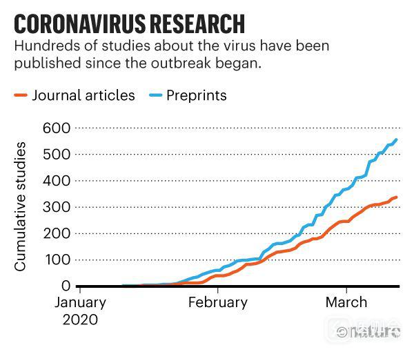 疫情爆发促使相关研究激增。为了估算这类研究的规模,Nature在bioRxiv,medRxiv,ChemRxiv、ChinaXiv上使用“novel coronavirus”,“ ncov”,“COVID-19”和“SARS-CoV-2”等关键词进行检索 ,同时检索了WHO出版物列表和Google Scholar上的发表文章。截至3月12日,已有约900篇相关论文、预印本和初步报告发表。