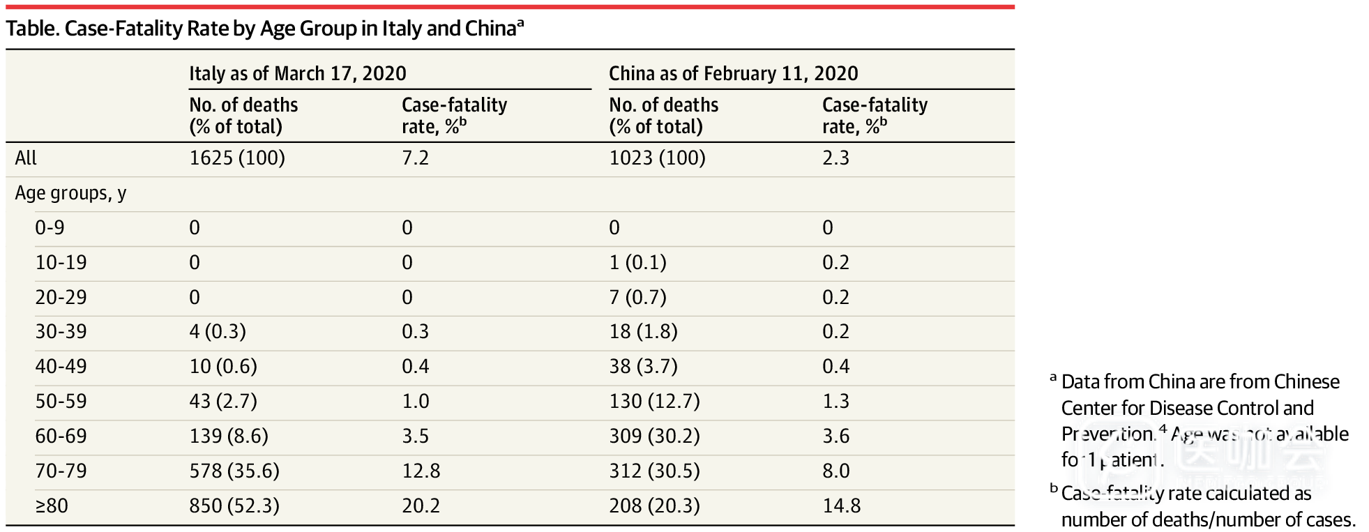 表. 意大利和中国不同年龄组人群的病死率