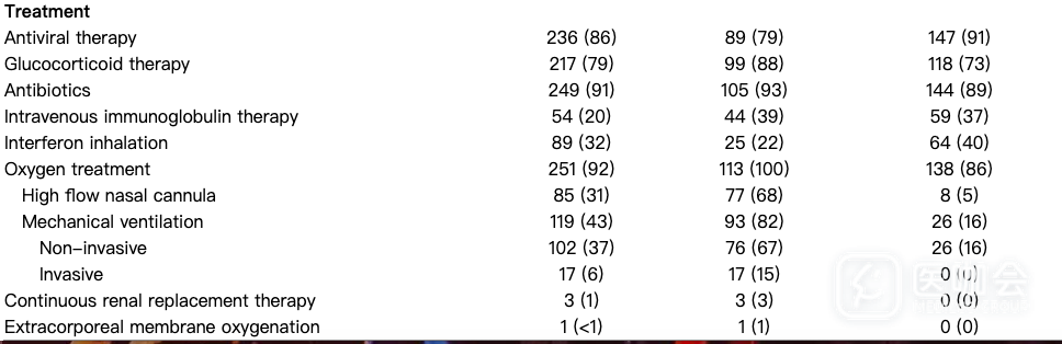 与康复患者相比,死亡患者接受抗病毒药物(奥司他韦,阿比多尔,洛匹那韦/利托那韦)单药或联合治疗的占比更少(89;79% vs 147;91%);考虑到死亡患者肺炎更严重、易出现“细胞因子风暴”,死亡患者接受糖皮质激素治疗的占比高于康复患者(99; 88% vs 118; 73%)。