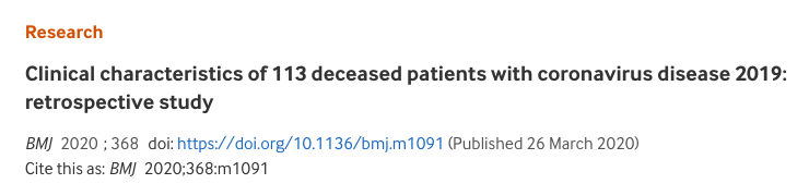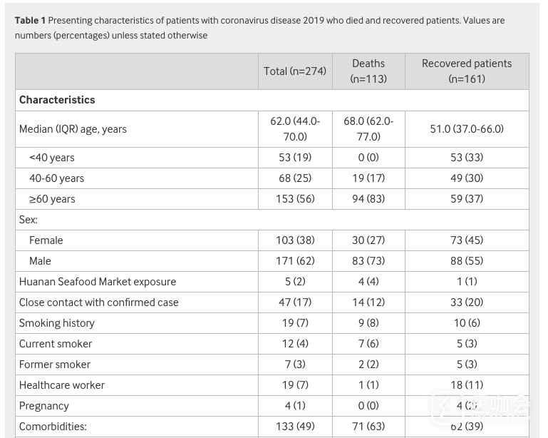 近日,华中科技大学同济医学院附属同济医院的研究者们在BMJ发表了一篇文章《Clinical characteristics of 113 deceased patients with coronavirus disease 2019: retrospective study》,对该院799例COVID-19患者截止到2020年2月28日的数据进行了回顾性分析,其中113例死亡,161例康复出院。