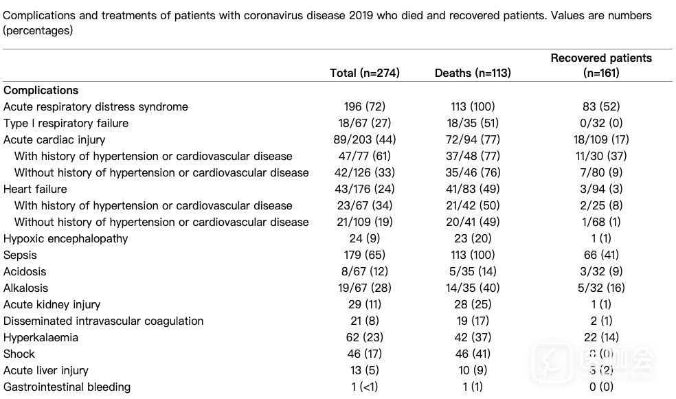 死亡患者中较少见的并发症包括酸中毒,弥散性血管内凝血和急性肝损伤。一名死亡患者出现胃肠道出血。伴有心血管基础疾病的患者更容易发生急性心脏损伤和心力衰竭。