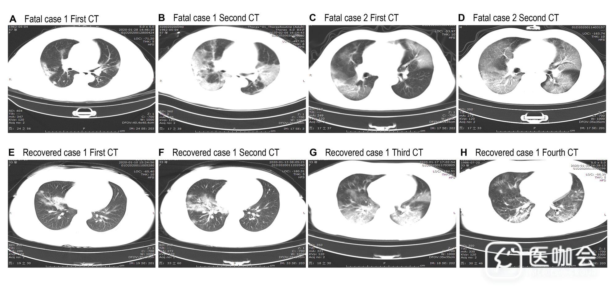 康复患者的典型CT表现为右中叶和下叶毛玻璃样混浊和实变(图1,E和F);然后进展为双侧毛玻璃样混浊和双侧肺实变,但右中叶实变消退(图1,G)。随访图像显示双侧毛玻璃浑浊和实变得到明显改善(图1,H)。