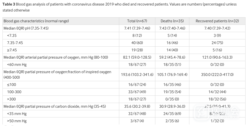 研究人员测量了35例死亡患者和32例康复患者的动脉血气,见表3。