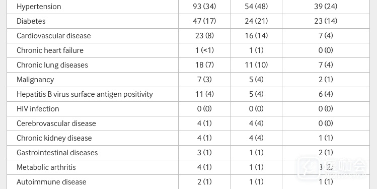 总体而言,71例死亡患者(63%)和62例康复患者(39%)至少患有一种慢性病。死亡患者中伴有高血压、心血管疾病和脑血管疾病的情况(54[48%],16[14%]、4[4%])比康复患者(39[24%],7[4%] 、0[0%])更为常见。