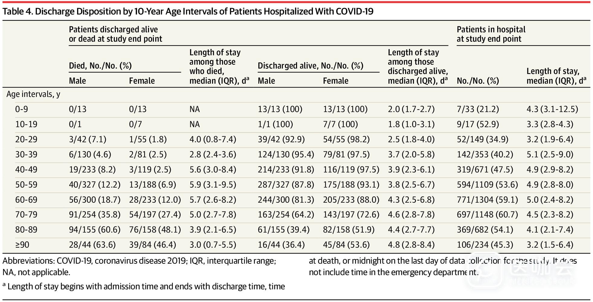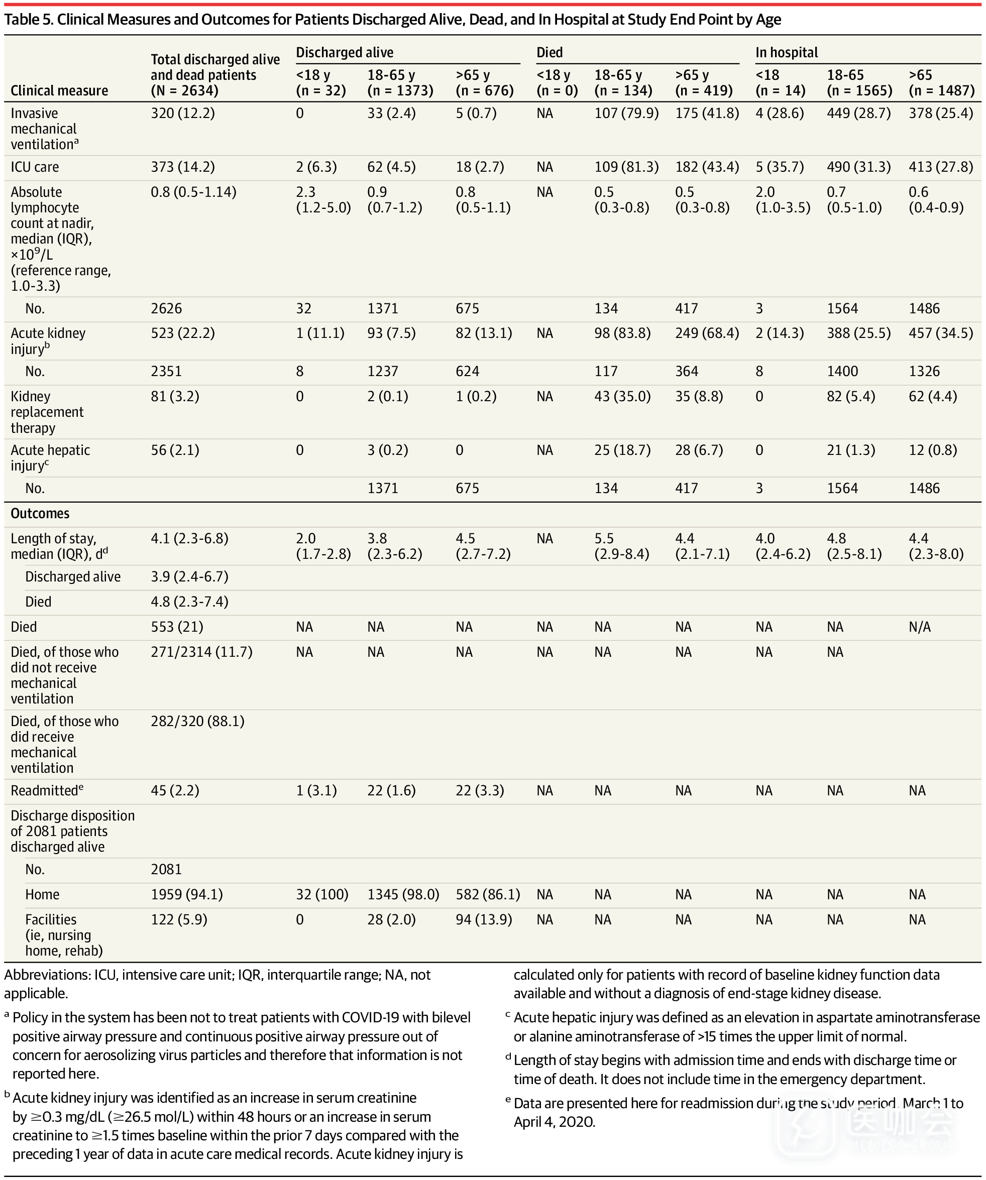 本研究是美国首个大型的连续纳入COVID-19住院患者的病例系列报道。本研究中,老年人、男性、伴有高血压和糖尿病的患者很常见,这与中国的数据很相似。本研究仅报告了具有明确结局(已出院或死亡)患者的死亡率,更长期的研究可能会发现不同人群的死亡率有所不同。本研究发现机械通气患者的死亡率高,与另一项针对美国危重患者的小型研究的结果相似。