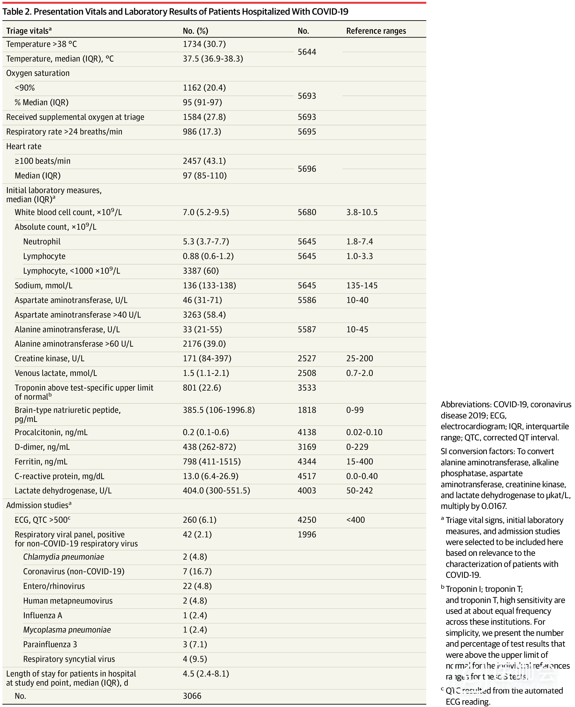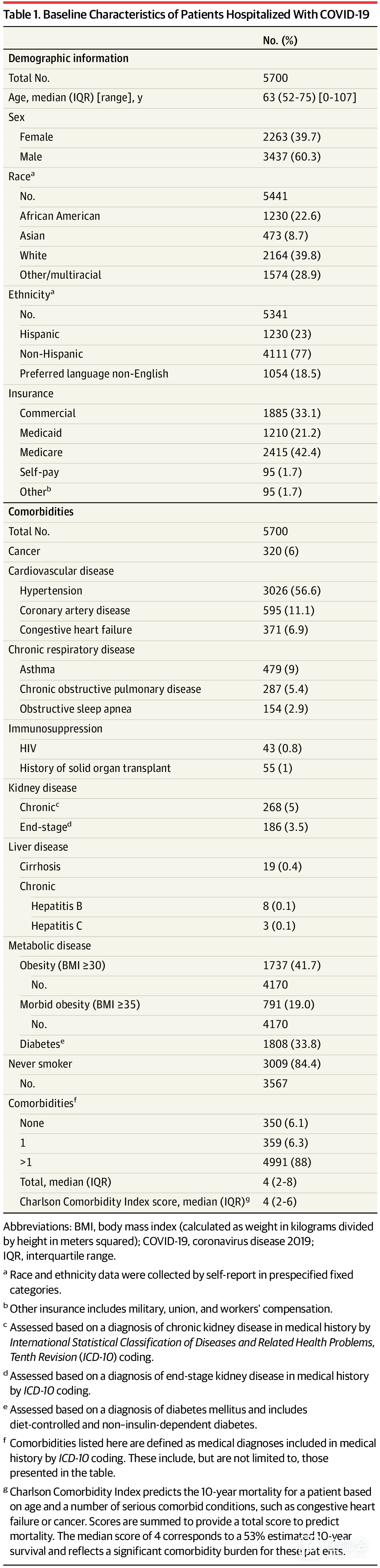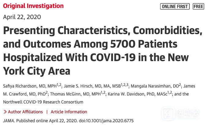 2020年4月22日,JAMA刊登了一项最新研究《Presenting Characteristics, Comorbidities, and Outcomes Among 5700 Patients Hospitalized With COVID-19 in the New York City Area》。该研究纳入纽约12家医院收治的5700例COVID-19病例,入院日期为2020年3月1日至2020年4月4日,研究详细描述了这些患者的临床特征、合并症和结局情况。