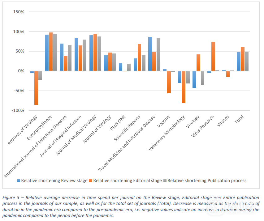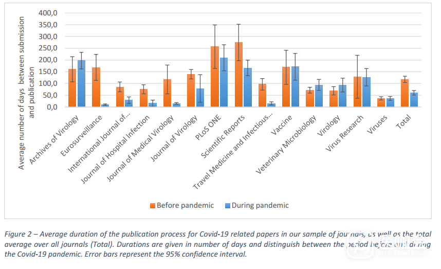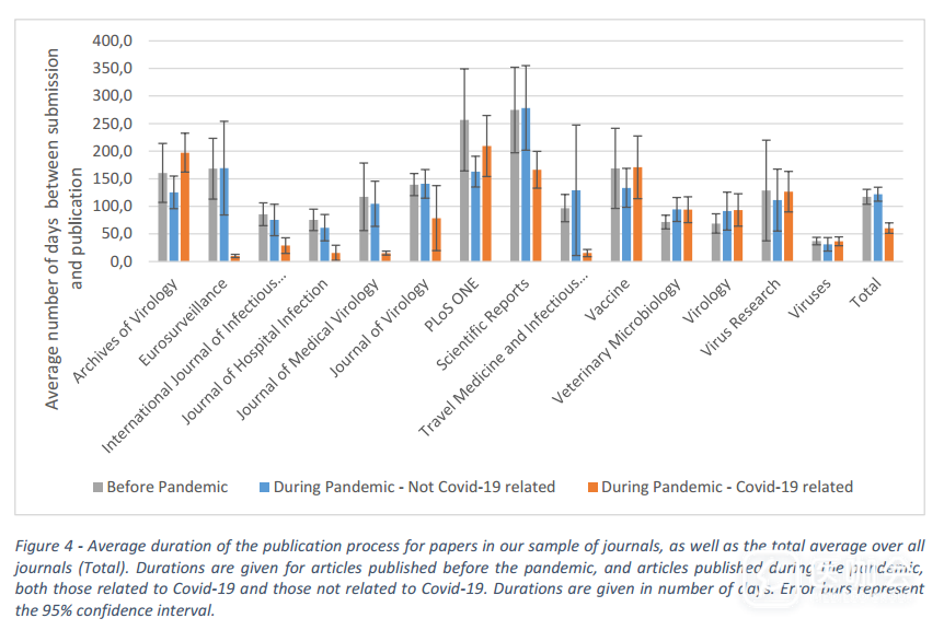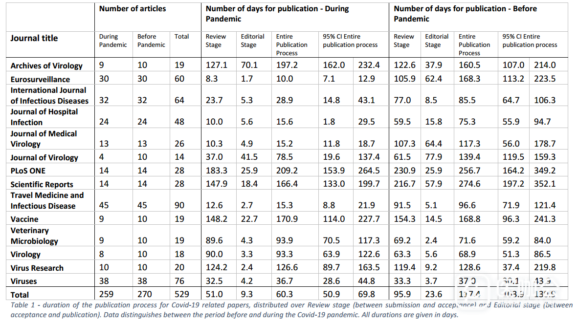本文分析表明,自大流行以来,期刊已经大大加快了Covid-19相关研究的发表,学术期刊的出版时间缩短了49%,平均缩短了57天。一些期刊甚至缩短了80%以上,主要包括同行评审阶段和编审阶段,本研究样本的期刊分别缩短了47%(45天)和61%(14天)。这种加速发表只是涉及到Covid-19相关文章,Covid-19无关的文章与大流行前相似。