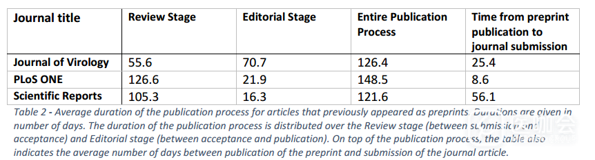 如图1所示,自大流行以来,Covid-19相关的预印本文章急剧增加。2102篇预印本文章中,已有129篇在期刊上正式发表。这129篇文章发表在68本学术期刊上,发表预印本最多的三本期刊是《 Journal of Virology》、《PLoS ONE》和《Scientific Reports》,作者分析了这三本期刊的发表周期,结果见表2。预印本文章本身的发表周期比期刊发表的发表周期要短得多,但本研究也发现,大流行期间预印本的发表周期并没有比大流行前有所缩短。