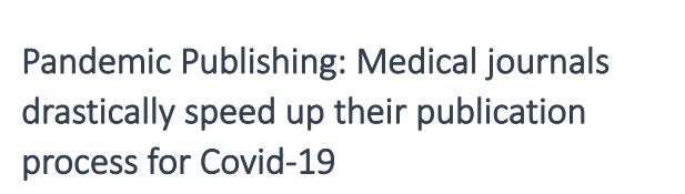 为了评估医学期刊是否加快了Covid-19相关文章的发表速度,一项研究对14种医学期刊在大流行期间和之前的发表速度进行了评估。通过对669篇文章的评估,研究发现,疫情爆发以来,医学期刊大大加快了Covid-19相关文章的发表速度。与大流行之前在同一期刊上发表的文章相比,发表周期平均缩短了49%,这主要由于同行评审时间的缩短。但与Covid-19无关的文章,发表速度并没有加快。但是这种加快也引起了大家对同行评审可靠性的关注。
