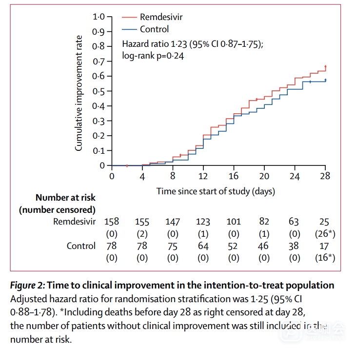 最终随访时间为2020年4月10日。ITT分析中,瑞德西韦组与对照组的至临床改善时间无明显差异(瑞德西韦组21.0天[IQR 13.0–28.0];对照组23.0天[15.0–28.0];HR 1.23 [95%CI 0.87-1.75];图2)。PP分析得出类似的结果(HR 1.27 [95%CI 0.89-1.80])。