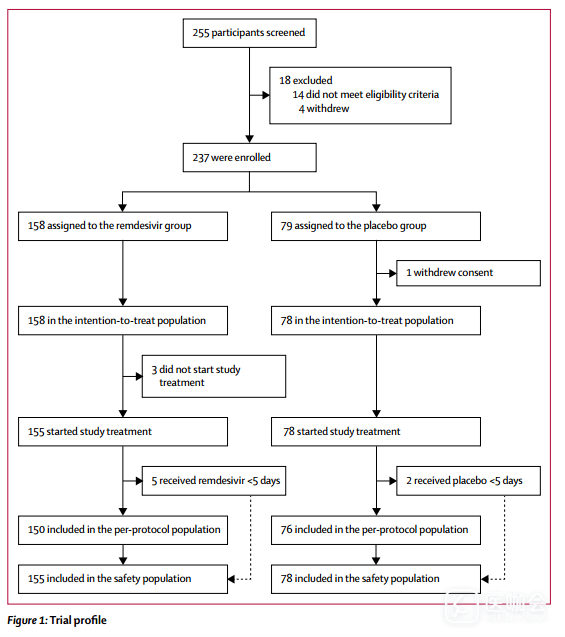 2020年2月6日至2020年3月12日,237例患者符合入组标准(图1)。158例患者被随机分配到瑞德西韦治疗组,79例到安慰剂对照组。安慰剂组中的一名患者在随机分组后撤回了知情同意书,因此ITT分析最终纳入了158例试验组患者和78例对照组患者。
