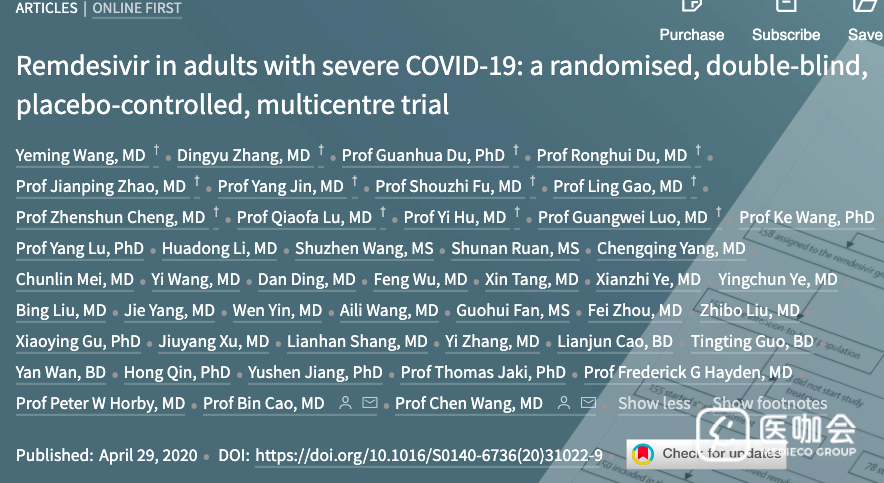 Lancet发布中国最新研究成果,瑞德西韦治疗重症Covid-19患者未见明显益处