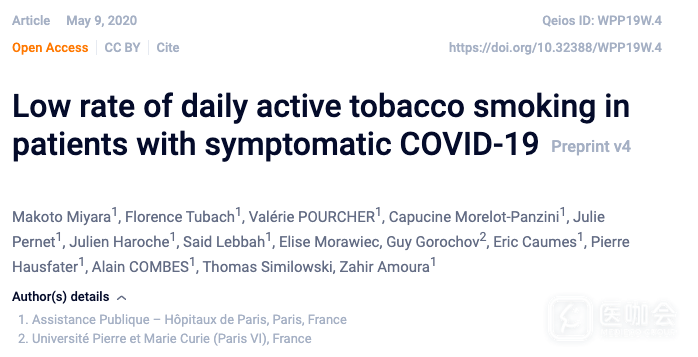 研究发现,COVID-19住院患者中吸烟者占比4.4%,门诊患者中吸烟者占比5.3%。而相对于法国普通人群来说,该比例极低,据报道,法国2018年约有25.4%的人为每天吸烟者。