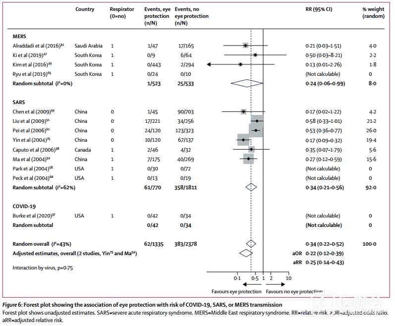 使用眼睛防护装置与较低的感染风险存在相关性(调整后OR=0.22,95%CI 0.12-0.39;RD=-10.6%,95%CI -12.5 to -7.7;图6)。