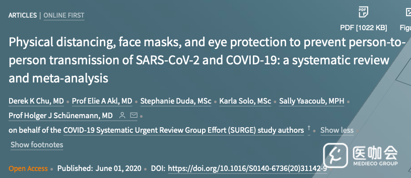 2020年6月1日,Lancet发布了一项系统评价和Meta分析,探讨采取社交距离(≥1m)、使用口罩和眼睛保护装置对冠状病毒的传播是否能起到防护作用。