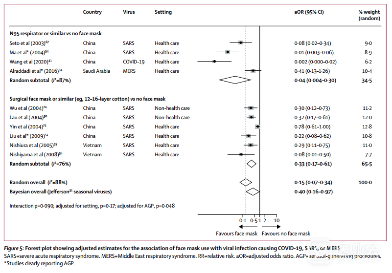 与一次性医用口罩或12~16层棉纱口罩相比,N95防护口罩或类似的呼吸器与感染风险降低的相关性更强(RR 0.33 vs RR 0.04; Pinteraction=0.090;图5)。