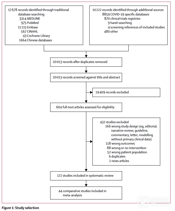 研究人员从文献数据库中(图1)检索了截止至2020年5月3日发表的冠状病毒相关文章,共纳入了来源于16个国家/地区的172项观察性研究,44项相关的比较性研究被纳入到Meta分析中(n=25697)。