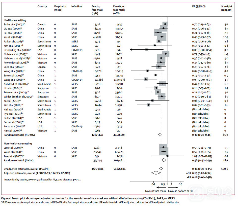 佩戴口罩与感染风险的显著降低存在相关性(调整后OR=0.15,95%CI 0.07-0.34;RD=-14.3%,95%CI -15.9 to -10.7;图4)。与非医疗机构相比,医疗机构中显示的这种相关性更强(RR 0.56 vs RR 0.30; Pinteraction=0.049)。