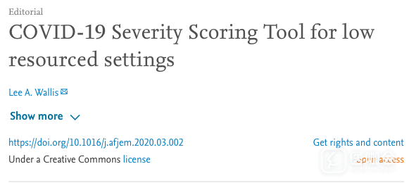 《African Journal of Emergency Medicine》的主编Lee Wallis在该期刊2020年4月2日的一篇社论中介绍了这个Covid-19严重程度评分工具。该工具由AFEM和Surgisphere合作开发,以预测Covid-19患者的严重程度,帮助临床医生决定如何将有限资源(如氧气支持和呼吸机)分配给最需要的患者。