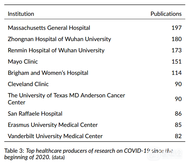 七、2020年初以来,发表Covid-19论文最多的医院包括武汉大学中南医院、武汉大学人民医院、麻省总医院。