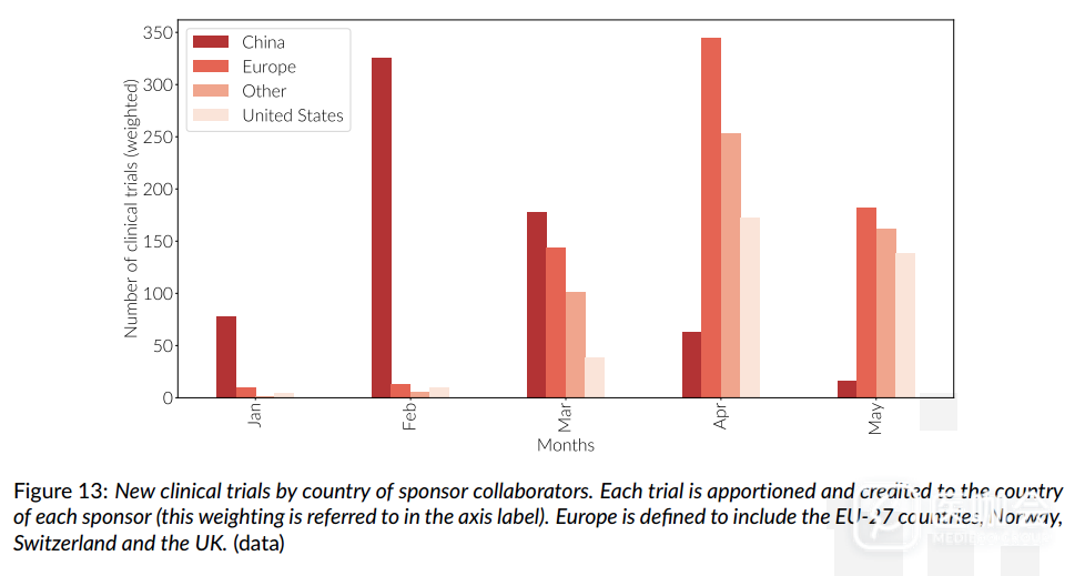 九、2020年1月和2月大部分临床试验的资助方来自中国,但3月开始逐渐下降。欧洲和美国在3月和4月持续增加,但5月也有所下降。