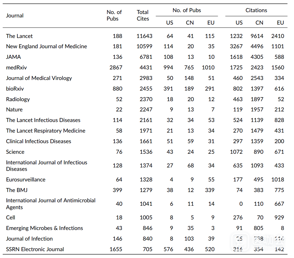表. 中国、美国、欧洲在不同期刊上的发文量和论文被引数