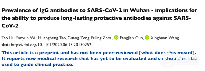 第一项研究于6月16日发表在预印本服务器medRxiv上,研究人员对武汉近1500名Covid-19患者进行了抗体筛查。研究人员将他们的抗体水平与另外三组人群进行了比较:近20000名普通人群;1600多名住院的非Covid-19患者;3800多名医务人员。作者认为医务人员在疫情爆发早期“不可避免地”接触过病毒,可能他们应该已经产生了抗体。