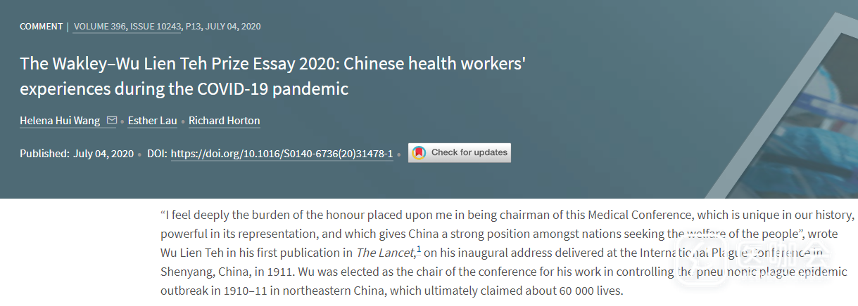 2019年,《柳叶刀》在中国设立了Wakley- Wu Lien Teh Prize(威克利-伍连德奖),让世界能够聆听当代中国医生的声音。该奖项每年邀请中国医务工作者撰写文章,讲述行医过程中的经历与疑虑。