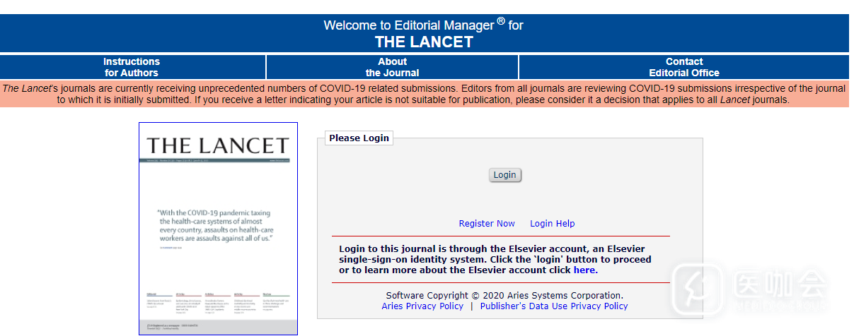 提交稿件的截止时间为2020年10月31日,需通过柳叶刀在线提交系统提交,网址为:https://www.editorialmanager.com/thelancet/default.aspx。