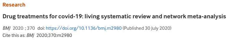近日,BMJ刊登了一篇文章,对COVID-19药物治疗的临床试验进行了实时系统评价(living systematic review)和网状Meta分析(network meta-analysis)。数据来自美国CDC的COVID-19数据库(包含25个电子数据库)和6个中文数据库,检索日期截止到2020年7月20日。