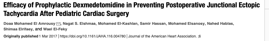2017年3月发表在JAHA上的这篇论文,题为《Efficacy of Prophylactic Dexmedetomidine in Preventing Postoperative Junctional Ectopic Tachycardia After Pediatric Cardiac Surgery 》,通讯作者为El Amrousy。