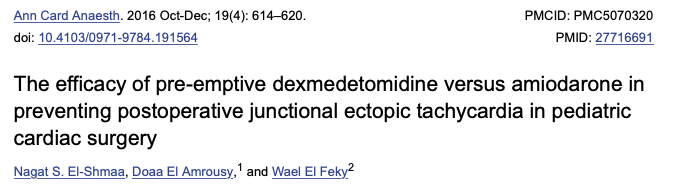 而2016年10月发表的这篇论文,发表日期仅在上一篇论文发表的前几个月,题为《The efficacy of pre-emptive dexmedetomidine versus amiodarone in preventing postoperative junctional ectopic tachycardia in pediatric cardiac surgery》,发表在《Annals of Cardiac Anesthesia》(以下简称ACA)上,JAHA那篇论文的通讯作者El Amrousy为该论文的作者之一。
