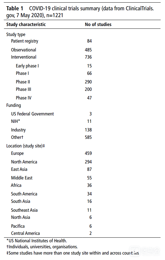 截至2020年5月7日,ClinicalTrials.gov上显示已有1221项关于COVID-19的注册研究(表1)。其中214项(17.5%)研究的参与者包括儿童,1155项(94.6%)研究的参与者包括65岁及以上的成年人。243项(19.9%)研究的队列为健康志愿者,其中13项(5.4%)是关于疫苗的临床试验。