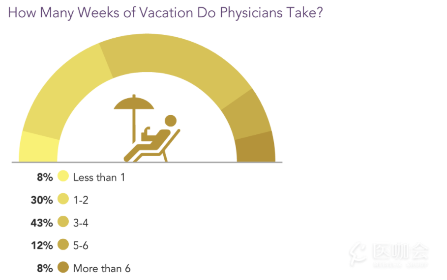 接近一半的医生一年能休假3-4周,20%的医生一年休假时间可超过5周。